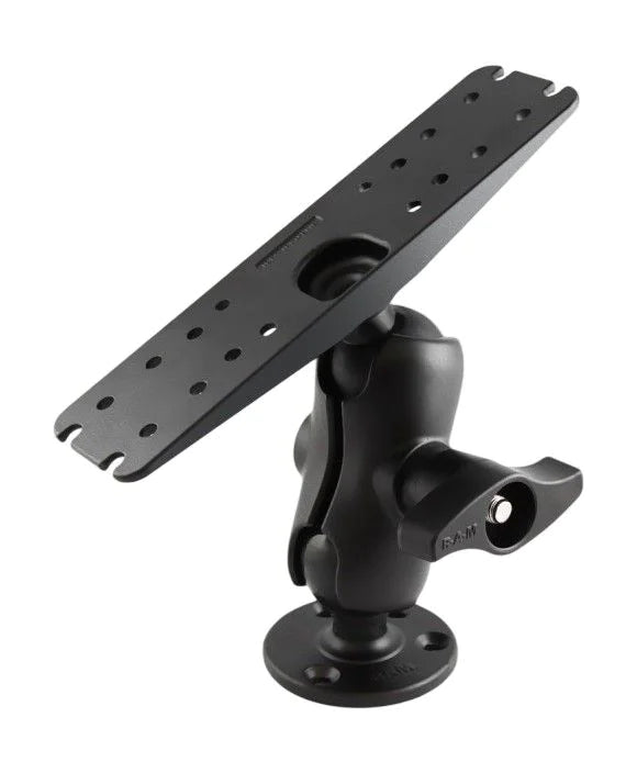 Platine spécialement conçue pour le système RA-H4, boule D intégrée pour une fixation stable, fabrication en aluminium marin résistant à la corrosion, conception étudiée pour limiter les vibrations et garantir une orientation fluide des appareils lourds.